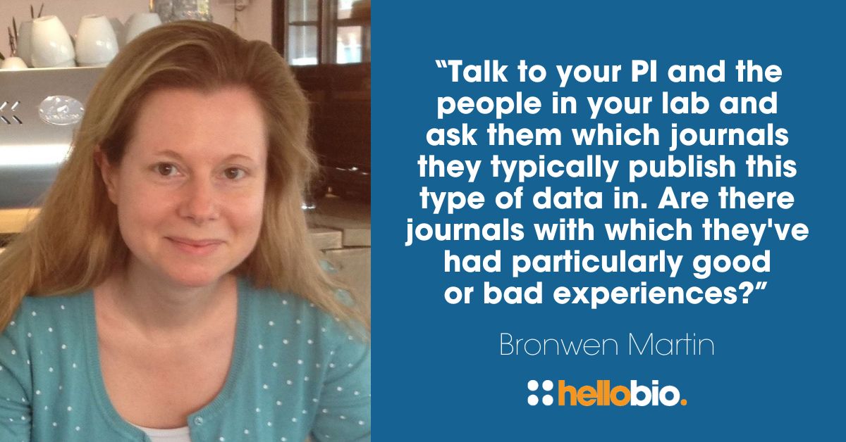 Dr Bronwen Martin, a Scientific Editor & Research Communicator in the Faculty of Pharmaceutical, Biomedical and Veterinary Sciences at the University of Antwerp, Belgium, shared her thoughts on this approach. She told us: “Talk to your PI and the people in your lab and ask them which journals they typically publish this type of data in. Are there journals with which they've had particularly good or bad experiences? Get feedback and advice from the people working around you because they might be able to offer you some valuable information.”