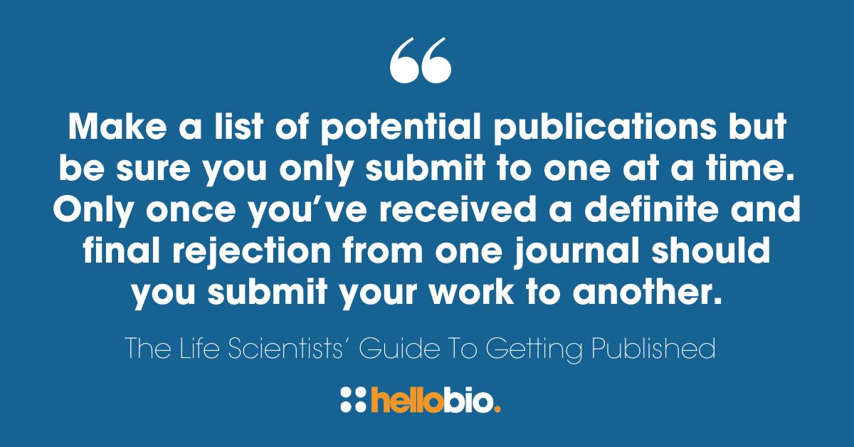 When it comes to choosing journals to submit to, by all means make a list of potential publications but be sure you only submit to one at a time! For most journals this is a strict policy because it prevents any potential confusion or copyright issues should communication breakdowns occur later down the line. Only once you’ve received a definite and final rejection from one journal should you submit your work to your next preferred journal.