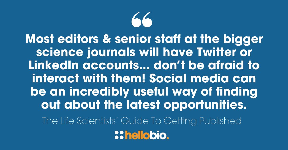 Don’t disregard social media - it’s a powerful tool and a great way of making professional contacts and connections. Most editors and senior staff at the bigger science journals will have Twitter or LinkedIn accounts and will be active in other online spaces. Be sure to follow those that you are interested in and don’t be afraid to interact with them! Social media can be an incredibly useful way of finding out about the latest publishing opportunities.